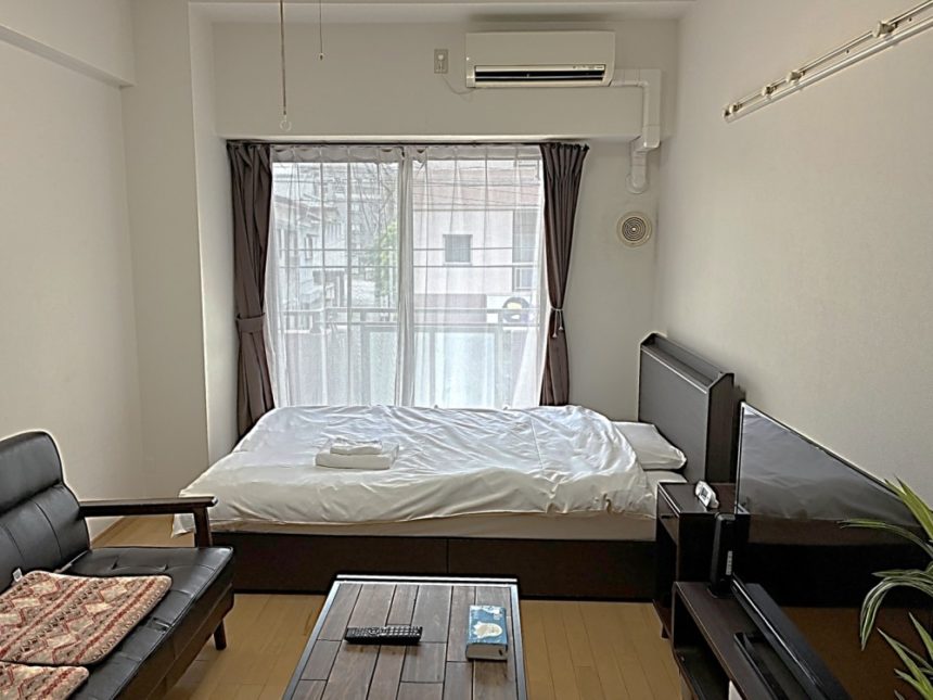 お部屋は広めの1Kタイプ。すぐにご入居ができるようにベッドやお布団など家具類やテレビや冷蔵庫など家電類をご用意しております。